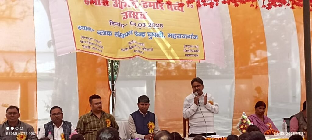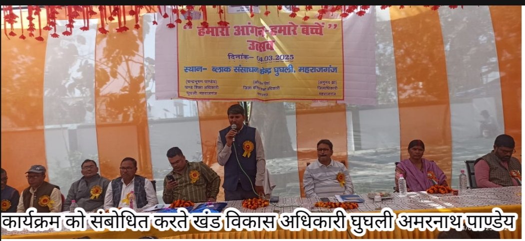 घुघली (हर्षोदय टाइम्स) : महराजगंज जनपद के बीआरसी घुघली में बेसिक शिक्षा विभाग द्वारा जनपद स्तरीय हमारा आंगन- हमारे बच्चे उत्सव कार्यक्रम का आयोजन किया गया। कार्यक्रम का शुभारंभ दीप प्रज्ज्वलन के साथ सहायक विकास अधिकारी पंचायत श्याम सुंदर तिवारी व खण्ड विकास अधिकारी घुघली द्वारा किया गया।