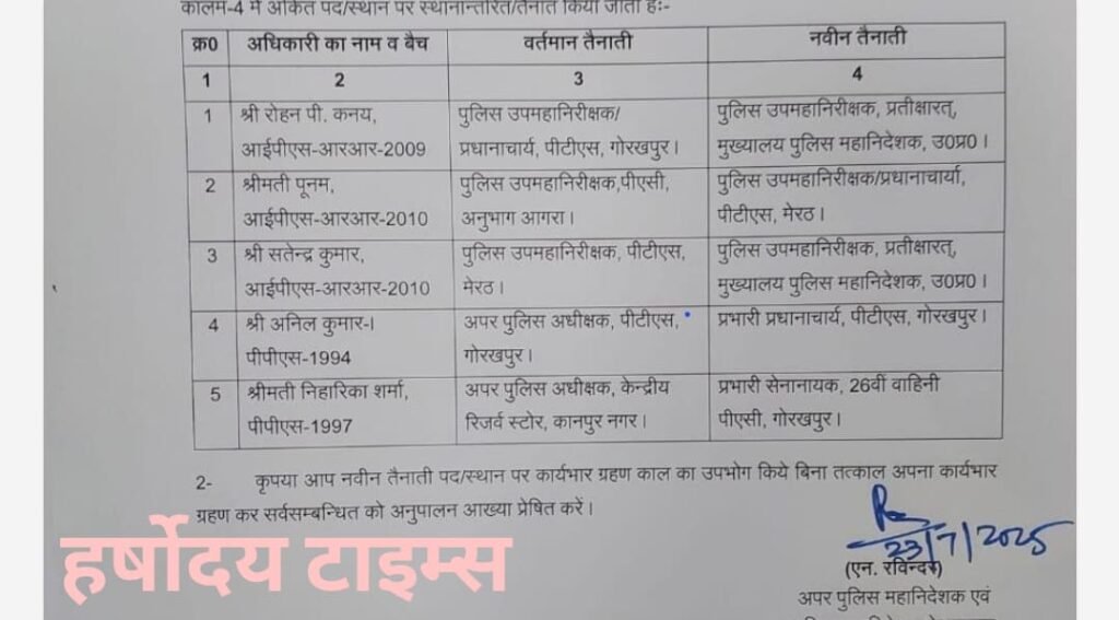 प्रशासनिक आदेश संख्या डीजी-1-18 (07)-2025 दिनांक 23 जुलाई 2025 को जारी किया गया, जिसमें सभी स्थानांतरित अधिकारियों को तुरंत कार्यभार ग्रहण करने के निर्देश दिए गए हैं। साथ ही, समस्त पुलिस इकाइयों, जोनल डीआईजी, पीएसी बटालियनों, पुलिस आयुक्तों और अन्य संबंधित इकाइयों को आदेश की सूचना भेज दी गई है।
