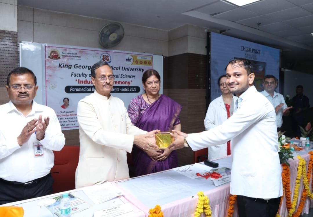 (भिटौली) महराजगंज: विकासखंड परतावल के तरकुलवा तिवारी निवासी मनीष तिवारी पुत्र कमलेश तिवारी को प्रधानमंत्री नरेंद्र मोदी जी के जन्मदिन के अवसर पर केजीएमयू लखनऊ में उत्कृष्ट भाषण के लिए सम्मानित किया गया । किंग जॉर्ज मेडिकल यूनिवर्सिटी (केजीएमयू) के पैरामेडिकल संकाय में गुरुवार को आयोजित इंडक्शन समारोह यादगार बन गया। अवसर था प्रधानमंत्री नरेंद्र मोदी के जन्मदिवस पर आयोजित उत्कृष्ट भाषण प्रतियोगिता के विजेताओं को सम्मानित करने का।