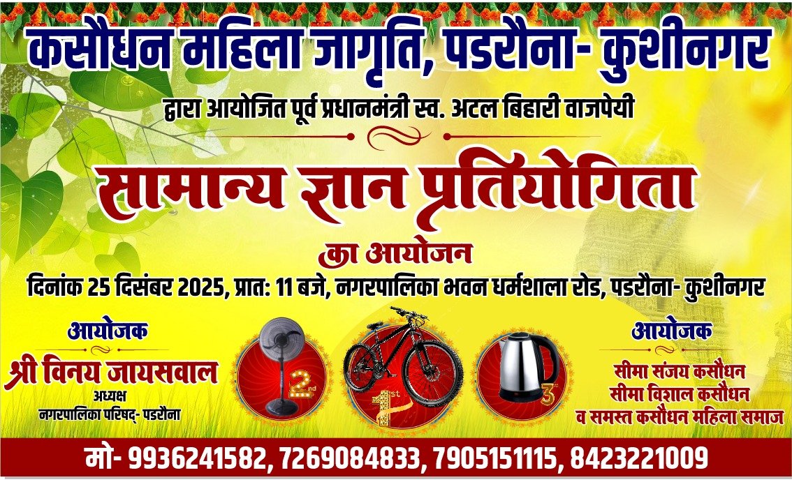 महाराजगंज। पूर्व प्रधानमंत्री स्व० अटल बिहारी वाजपेयी जी की स्मृति में पडरौना स्थित कसौधन महिला जागृति संस्थान द्वारा सामान्य ज्ञान प्रतियोगिता का आयोजन किया गया। प्रतियोगिता में जनपद के विभिन्न विद्यालयों के छात्र-छात्राओं ने उत्साहपूर्वक भाग लिया।