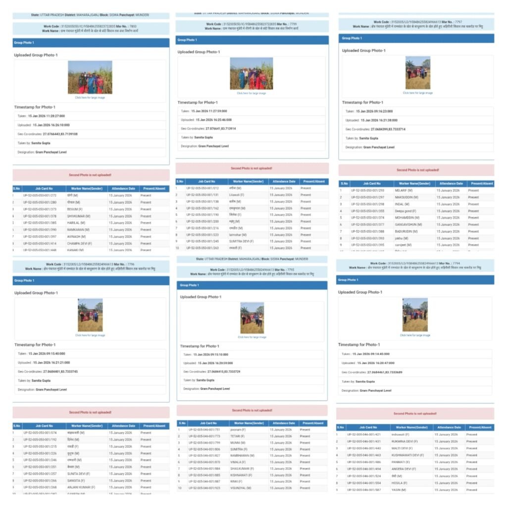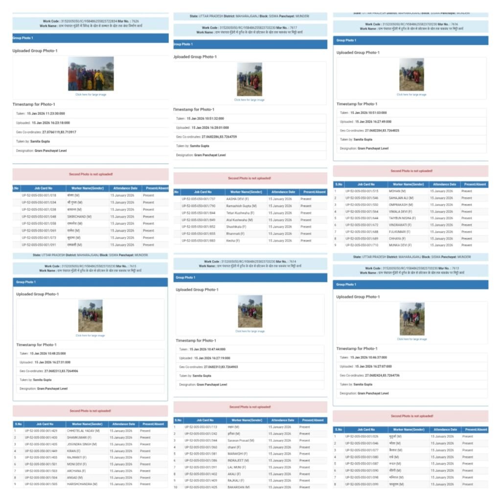 महराजगंज । सिसवा विकासखंड की मुड़ेरी ग्राम सभा में महात्मा गांधी राष्ट्रीय ग्रामीण रोजगार गारंटी योजना (मनरेगा) के तहत बड़ा फर्जीवाड़ा सामने आया है। आरोप है कि 15 जनवरी 2026 को कार्यस्थल पर मौजूद मात्र 40 मजदूरों की तस्वीरें अपलोड कर 189 मजदूरों की हाजिरी दर्ज कर दी गई। इस गंभीर अनियमितता ने मनरेगा जैसी जनकल्याणकारी योजना की पारदर्शिता पर सवाल खड़े कर दिए हैं।