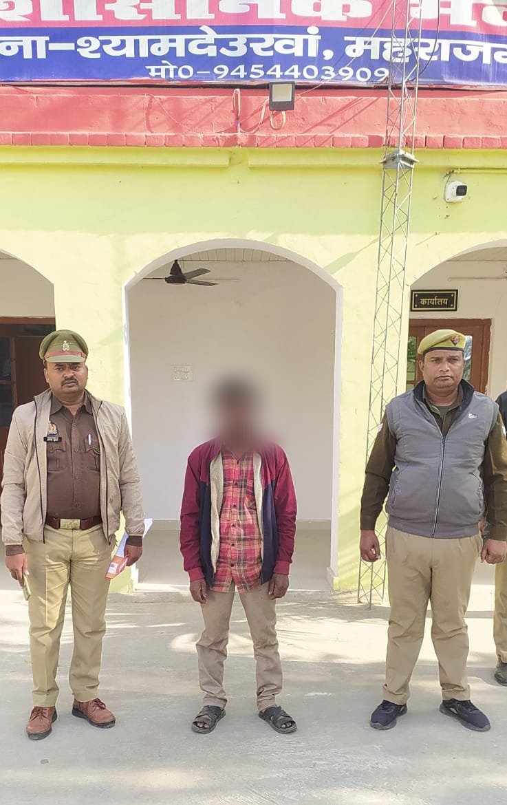 मुकदमा दर्ज होने के बाद मुखबिर की सूचना पर श्यामदेउरवा पुलिस ने अभियुक्त को अमवा पुल के पास से दिनांक 01.02.2026 को दोपहर 1:30 बजे गिरफ्तार कर लिया। गिरफ्तारी टीम में उपनिरीक्षक सुनील कुमार सिंह, उपनिरीक्षक चंद्रपाल यादव, उपनिरीक्षक अंजनी कुमार एवं कांस्टेबल अनिल यादव शामिल रहे। अभियुक्त के विरुद्ध विधिक कार्रवाई की जा रही है।