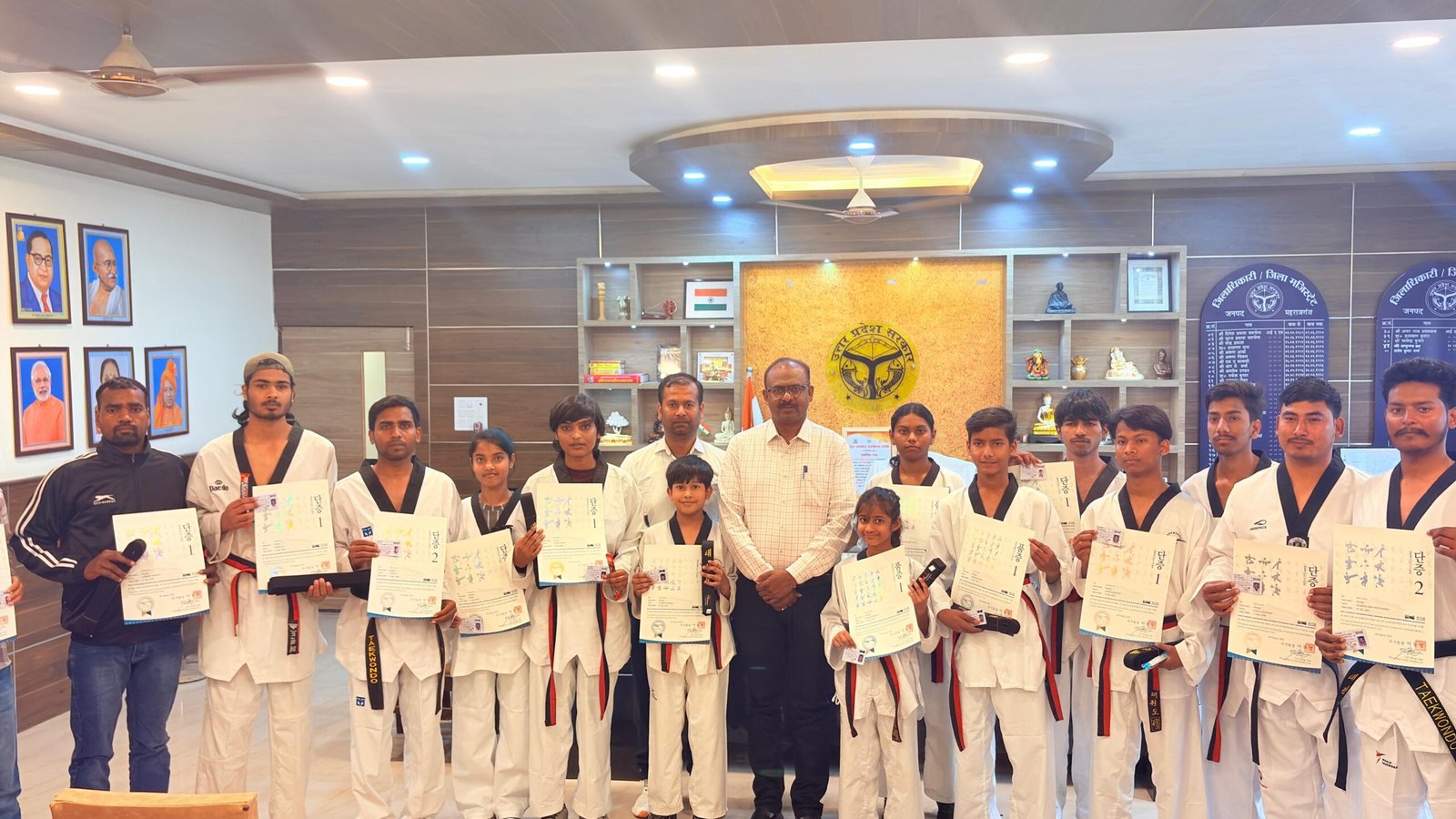 महराजगंज। जनपद के 16 ताइक्वांडो खिलाड़ियों को मंगलवार 10 मार्च को जिलाधिकारी द्वारा ब्लैक बेल्ट उपाधि प्रमाण पत्र देकर सम्मानित किया गया। यह प्रमाण पत्र वर्ल्ड ताइक्वांडो मुख्यालय कुक्कीवन, साउथ कोरिया द्वारा जारी किया गया है।