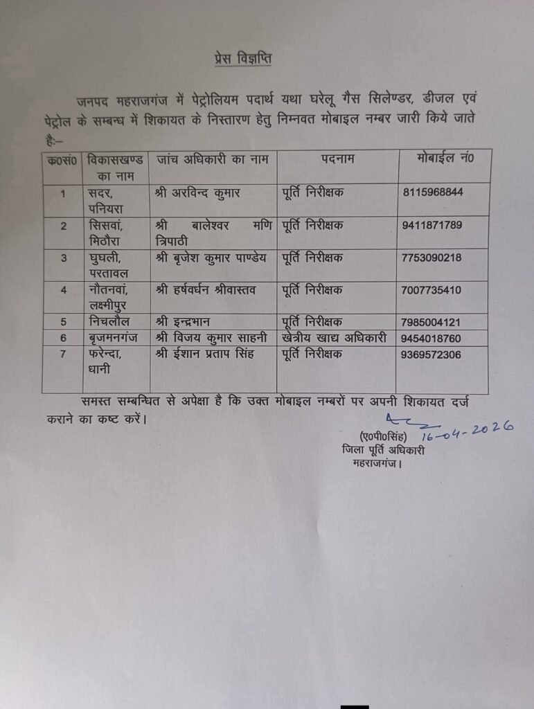 गौरतलब है कि गुरुवार को जिला प्रशासन की ओर से घरेलू गैस सिलेंडर, डीजल और पेट्रोल से संबंधित समस्याओं के समाधान हेतु जनपद के विभिन्न क्षेत्रों के लिए अधिकारियों के मोबाइल नंबर सार्वजनिक किए गए थे। इसी क्रम में नौतनवा व लक्ष्मीपुर क्षेत्र की जिम्मेदारी पूर्ति निरीक्षक हर्षवर्धन श्रीवास्तव को सौंपते हुए उनका मोबाइल नंबर 7007735410 जारी किया गया।