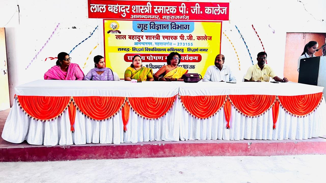 फरेंदा /महराजगंज!आज दिनांक 10/09/2024 को लाल बहादुर शास्त्री स्मारक पी०जी०काॅलेज आनंदनगर, महराजगंज में राष्ट्रीय पोषण माह कार्यक्रम का शुभारंभ गृह विज्ञान विभाग द्वारा किया गया। भारत सरकार के महिला एवं बाल विकास मंत्रालय द्वारा संचालित इस कार्यक्रम का उद्देश्य पोषण के विषय में जागरूकता बढ़ाना, आहार पद्धतियों में सुधार करना तथा बच्चों, किशोरों, गर्भवती महिलाओं और स्तनपान कराने वाली माताओं सहित कमजोर समूहों के बीच कुपोषण से निपटना है।