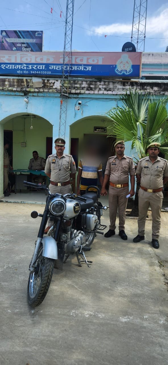 श्यामदेउरवा/ महराजगंज (हर्षोदय टाइम्स): पुलिस अधीक्षक महराजगंज के निर्देशन में चलाए गए विशेष अभियान में थाना श्यामदेउरवा पुलिस व एसओजी/स्वाट टीम की संयुक्त कार्रवाई में एक अंतर्जनपदीय वाहन चोर को गिरफ्तार किया गया है। इस दौरान टीम ने चोरी की बुलेट मोटरसाइकिल, एक मोबाइल फोन और 1200 रुपये नगद बरामद किया हैं।